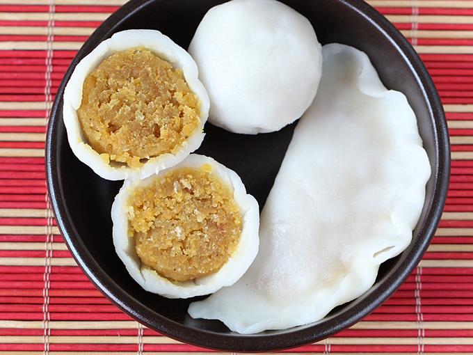 These mildly spiced rice and lentil dumplings with a smattering of fresh coconut are offered as neivedyam during Ganesh Chathurthi