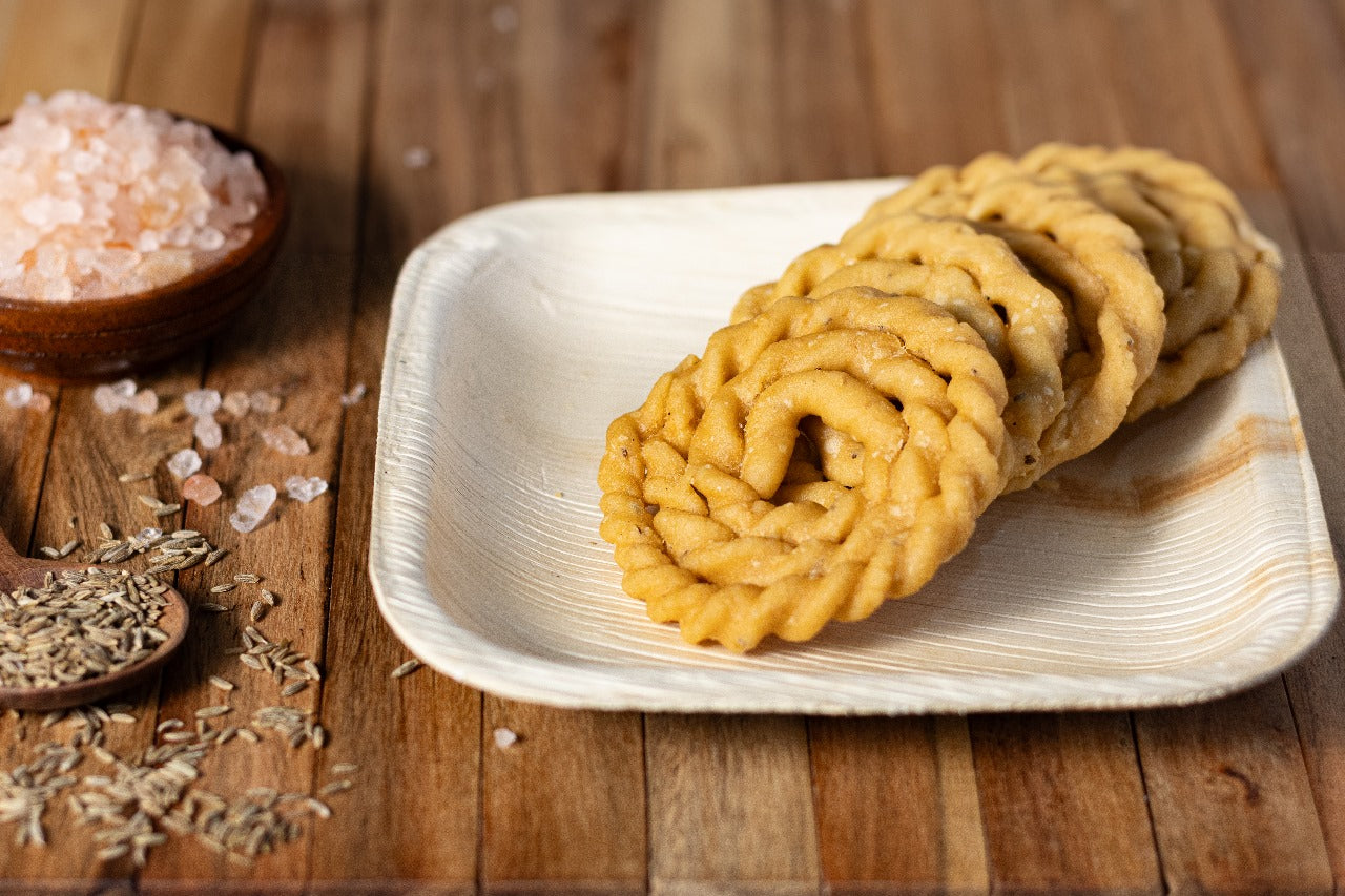 These crunchy savories are classic tea time snacks. They are made with rice flour, cumin seeds, nigella seeds, ghee and salt.